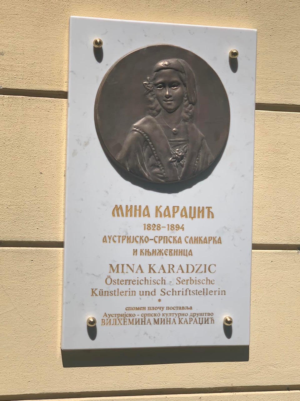 У Бечу је јуче, на згради Rasumowskygasse 22 у трећем бечком округу, постављена спомен-плоча Вилхелмини Мини Караџић, ћерки реформатора српског језика Вука Стефановића Караџића, чији се споменик налази испред исте зграде окружен цвећем и зеленилом.