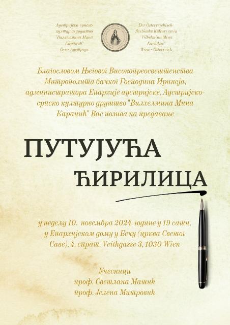 Част нам је да Вас позовамо на предавање  „Путујућа ћирилица“, које ће се одржати у Бечу, у недељу 10. новембра 2024. године, у 19 часова, у Храму Светог Саве, у сали Епархисјког дома, на четвртом спрату, у улици Veithgasse 3  1030 Wien.